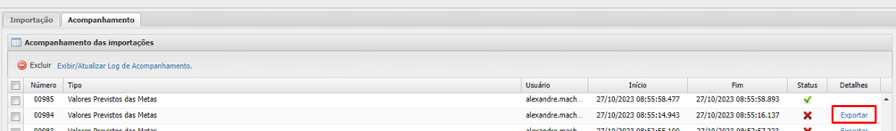 Se você tentar, por exemplo, importar os Valores Previstos, mas ter selecionado para importar Metas OKR sem perceber, a carga retornará com erro.