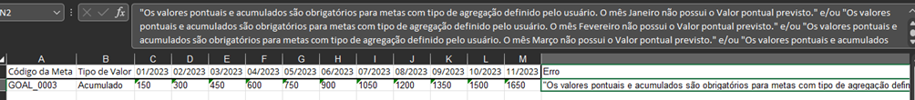 No exemplo abaixo, estamos considerando uma carga que foi feita com um preenchimento equivocado, pois faltou cadastrar também os valores pontuais da meta. Ao baixar o detalhamento do erro, temos uma nova coluna detalhando exatamente que “Os valores pontuais e acumulados são obrigatórios para metas com tipo de agregação definido pelo usuário”, trazendo essa informação para cada mês que estiver sem o pontual cadastrado: