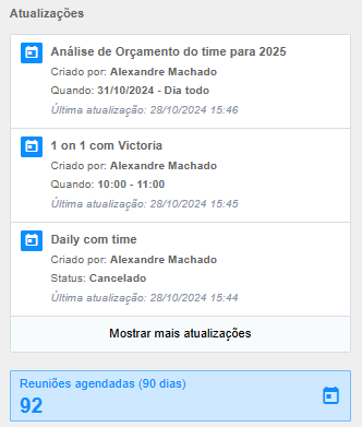 A seção de Atualizações lista as últimas modificações feitas em reuniões e tarefas, em ordem decrescente (das mais recentes às mais antigas). Isso permite que o usuário acompanhe as mudanças recentes de forma simples e prática: