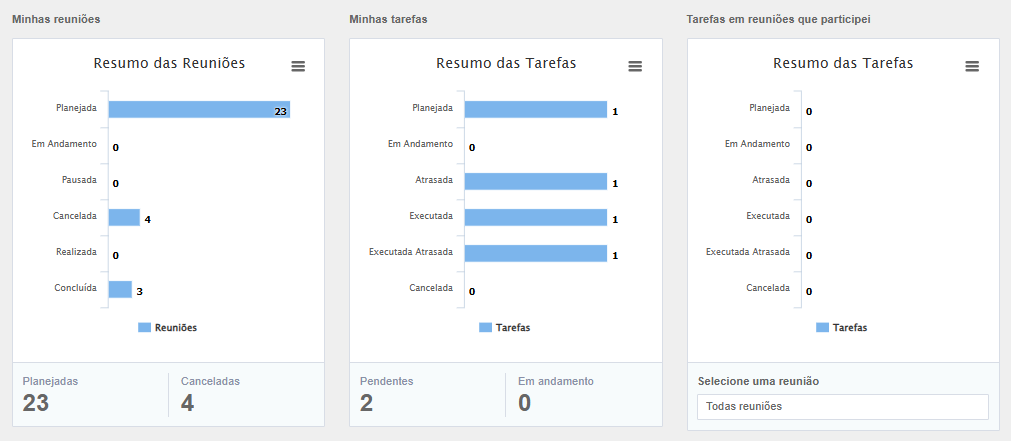 Minhas reuniões: Mostra a quantidade de reuniões em que o usuário está envolvido, classificadas por status: