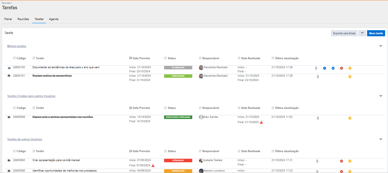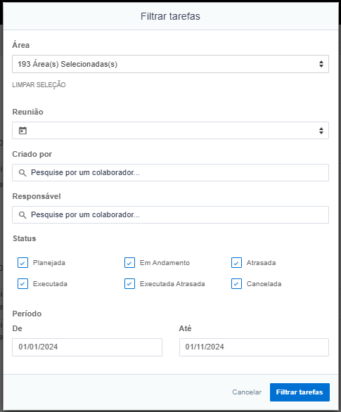 A tela de tarefas conta com filtros que permitem buscas detalhadas por área, reunião, criador, responsável, status e período, garantindo uma organização e uma visualização personalizáveis conforme a necessidade: