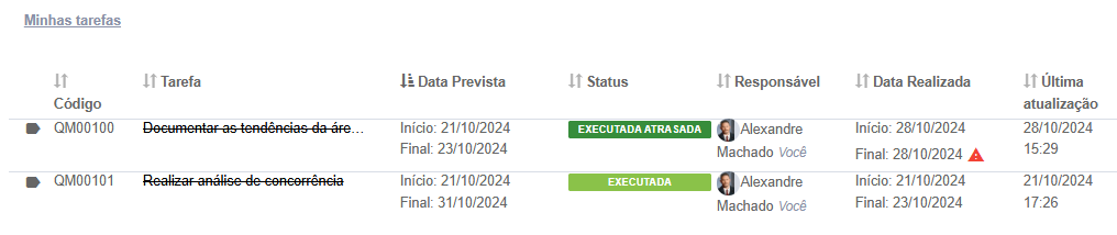 - Data Prevista: Data de início e término planejado para a tarefa.