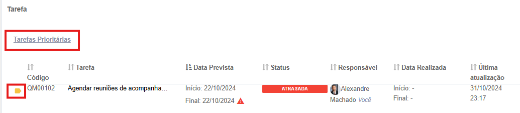 O painel também poderá exibir um ícone de atenção caso uma tarefa esteja atrasada, facilitando o acompanhamento de prazos: