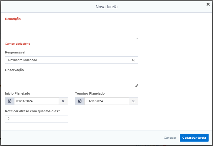 - Descrição (Obrigatório): Detalha a tarefa para compreensão clara; único campo obrigatório.