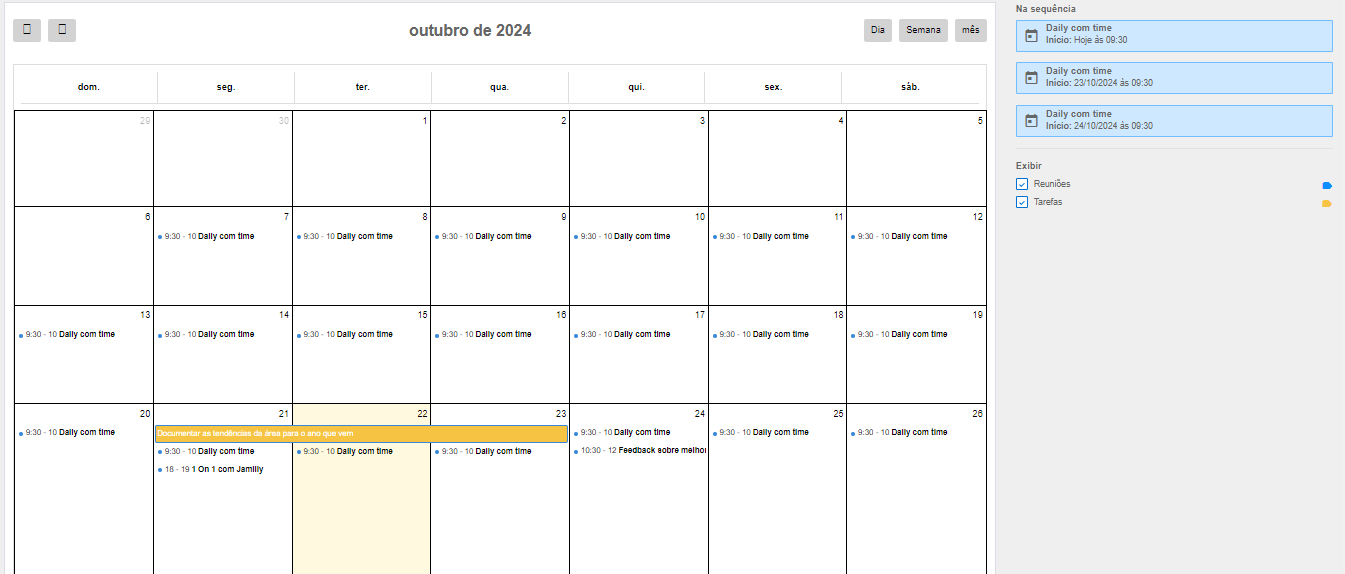 - Calendário Integrado: As reuniões e tarefas aparecem diretamente nas datas específicas, oferecendo uma visão clara e rápida das atividades previstas.