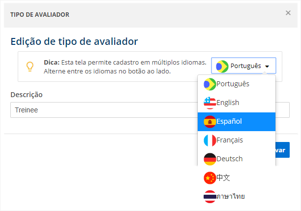 Para personalizar os tipos de avaliadores ou cadastrar a descrição em múltiplos idiomas, basta clicar no botão de editar