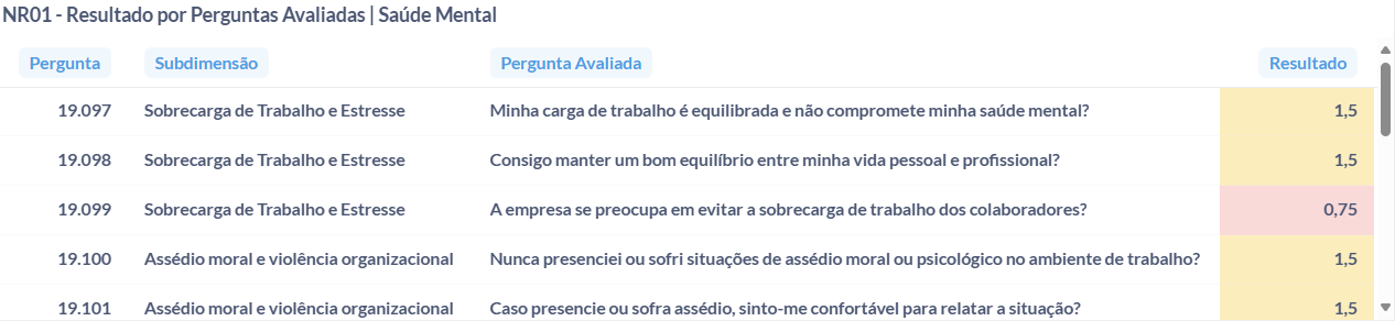 Ela inclui perguntas objetivas e assertivas, com base em boas práticas e diretrizes legais, que medem a percepção do colaborador sobre segurança, ergonomia, equilíbrio emocional, acolhimento, entre outros temas.