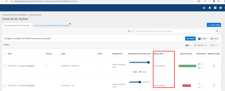 Incluímos uma nova coluna chamada “Tipo da Ação” na tela Central de Ações, permitindo identificar se a ação foi criada como: