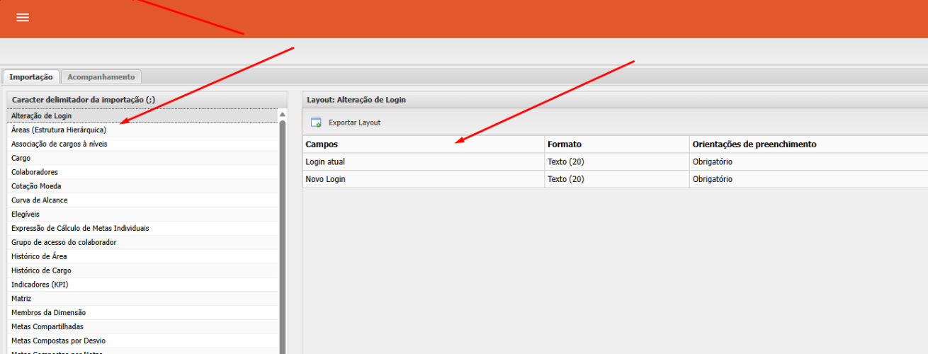 Core → Gestão de dados → Carga de dados → Alteração de Login → Exportar Layout