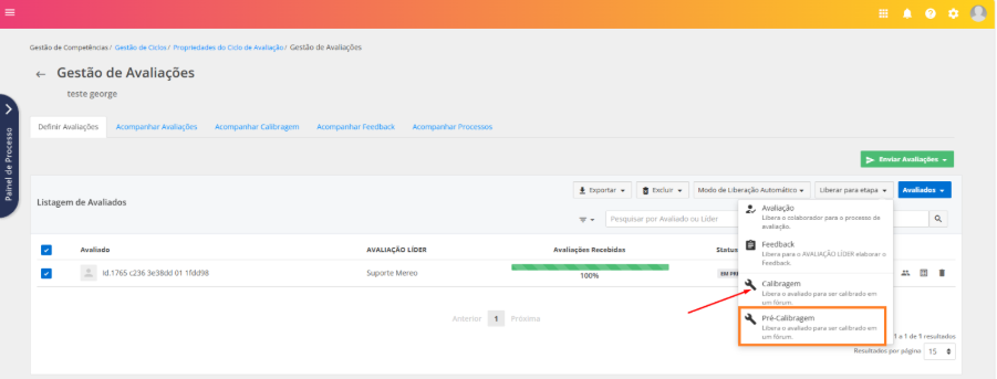 - A avaliação não aparecerá mais na lista de Pré-Calibragem do líder