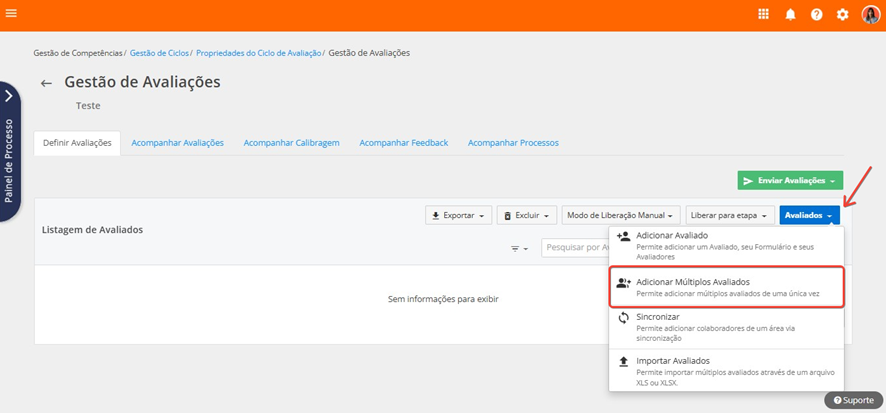 Para adicionar mais de um avaliado por vez ao ciclo de avaliações para ser editado manualmente, na tela Definir Avaliações, clique em Avaliados e selecione a segunda opção Adicionar Múltiplos Avaliados: