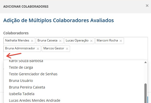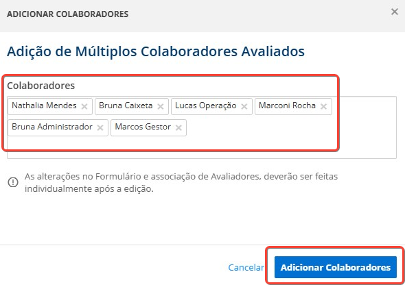 Esta funcionalidade permite a adição de múltiplos avaliados de uma única vez. É uma opção interessante para adicionar mais de um avaliado para ser editado manualmente, mas não vários, uma vez que será necessário incluir os formulários e os avaliadores desses avaliados um a um, manualmente, após a adição.