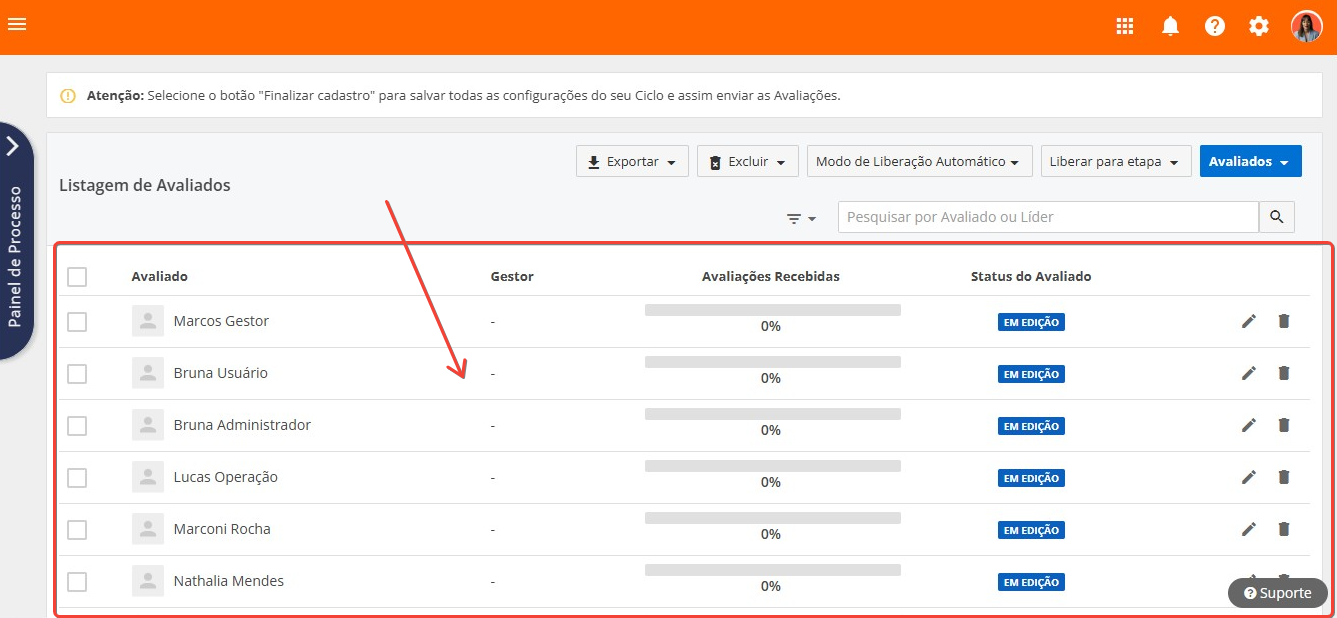 Ao finalizar este cadastro, os colaboradores aparecerão listado na aba Definir Avaliações, com o status em edição:
