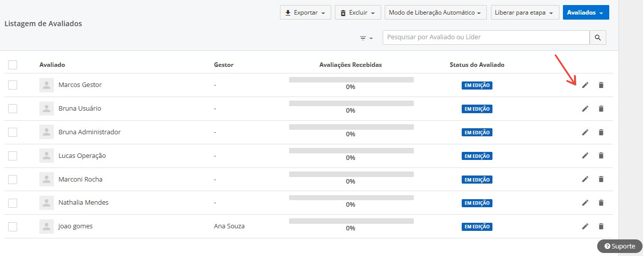 Adicione formulários e avaliadores para cada avaliado listado pelo ícone do lápis: