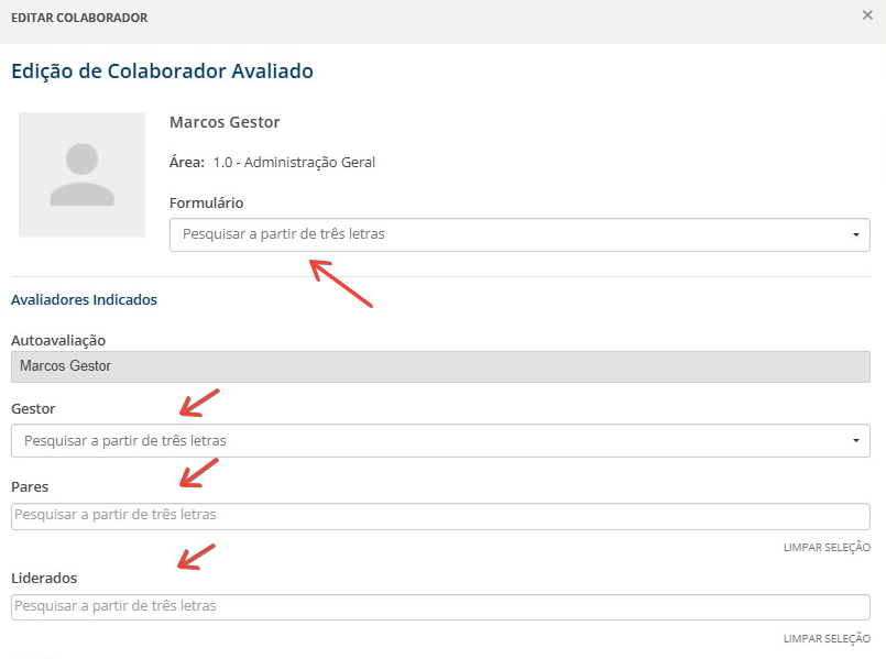 Na janela Editar Colaboradores, selecione o formulário de avaliação e os avaliadores do colaborador avaliado:
