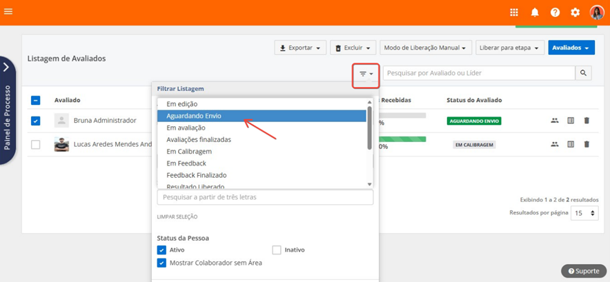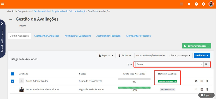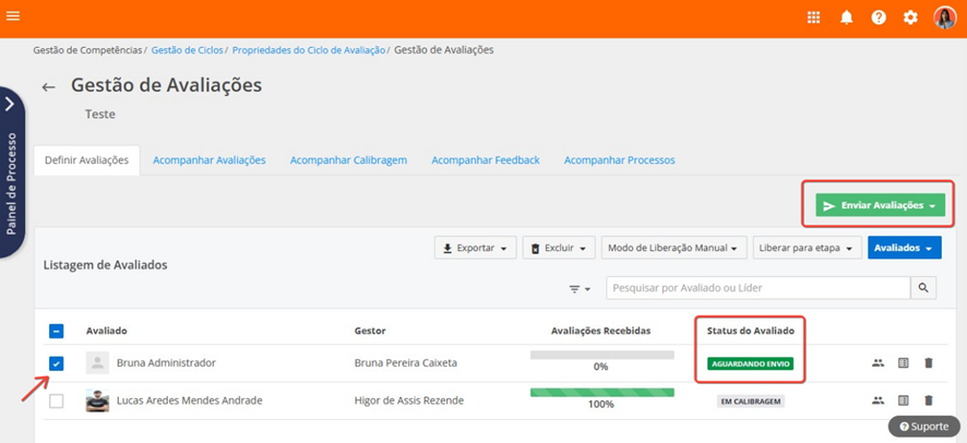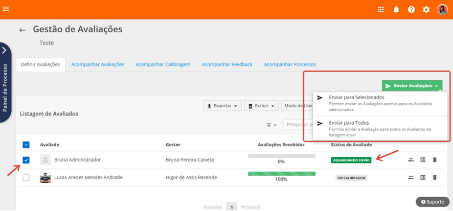 Será possível enviar avaliações para os colaboradores com os status aguardando envio.