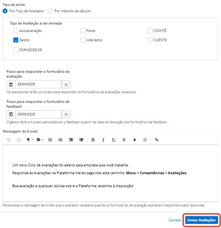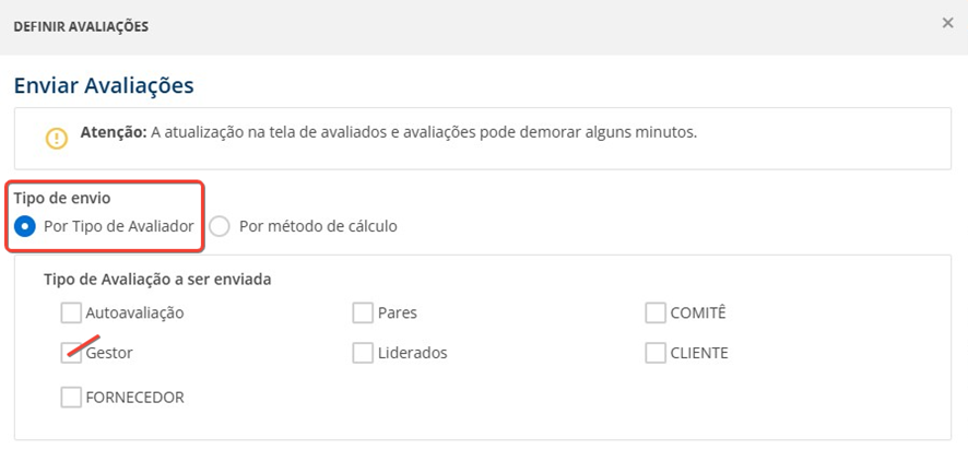 - Por tipo de avaliador: ideal para as ocasiões em que é preciso enviar um ou mais tipos específicos de avaliação. Por exemplo, se é preciso enviar apenas as avaliações de gestores, marque “gestor”, e assim por diante. Nesse modelo, será necessário repetir o processo para cada tipo de avaliador.