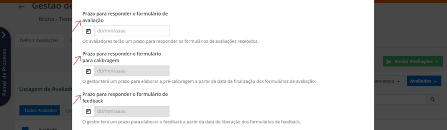 Definida a forma de envio das avaliações, será preciso definir, respectivamente, as datas limites para responder o formulário de avaliação, responder o formulário de calibragem e responder o formulário de feedback.
