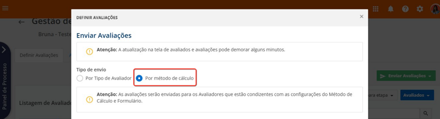 - Por método de cálculo: ideal para as ocasiões em que é preciso liberar ao mesmo tempo todos os tipos de avaliações associadas a um colaborador, que foram cadastrados na etapa de Configurações do Ciclo.