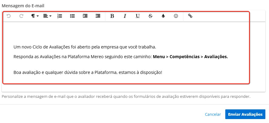 Por fim, personalize uma mensagem de e-mail que o avaliador receberá quando as avaliações estiverem disponíveis para serem respondidas.