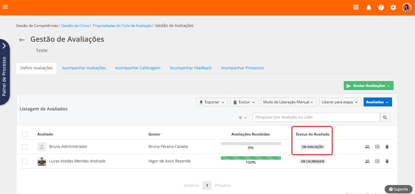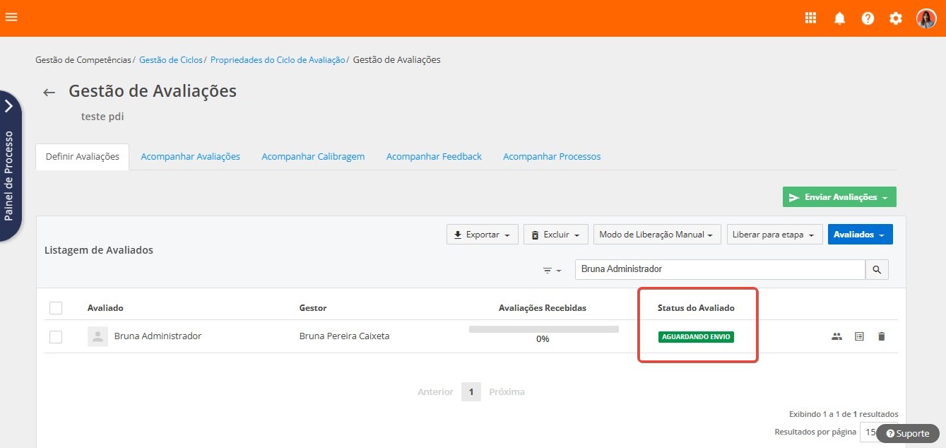 Se o colaborador ainda estiver com o status em edição, antes de enviar as avaliações, será necessário liberar manualmente esse colaborador para a etapa de avaliações, para o seu status mudar para aguardando envio, e, somente em seguida, enviar as avaliações.