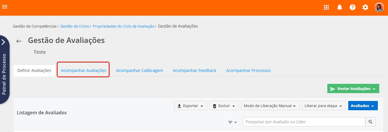 Isso indicada que as avaliações já foram disparadas. Para acompanhar o andamento das avaliações, acesse a aba Acompanhar Avaliações: