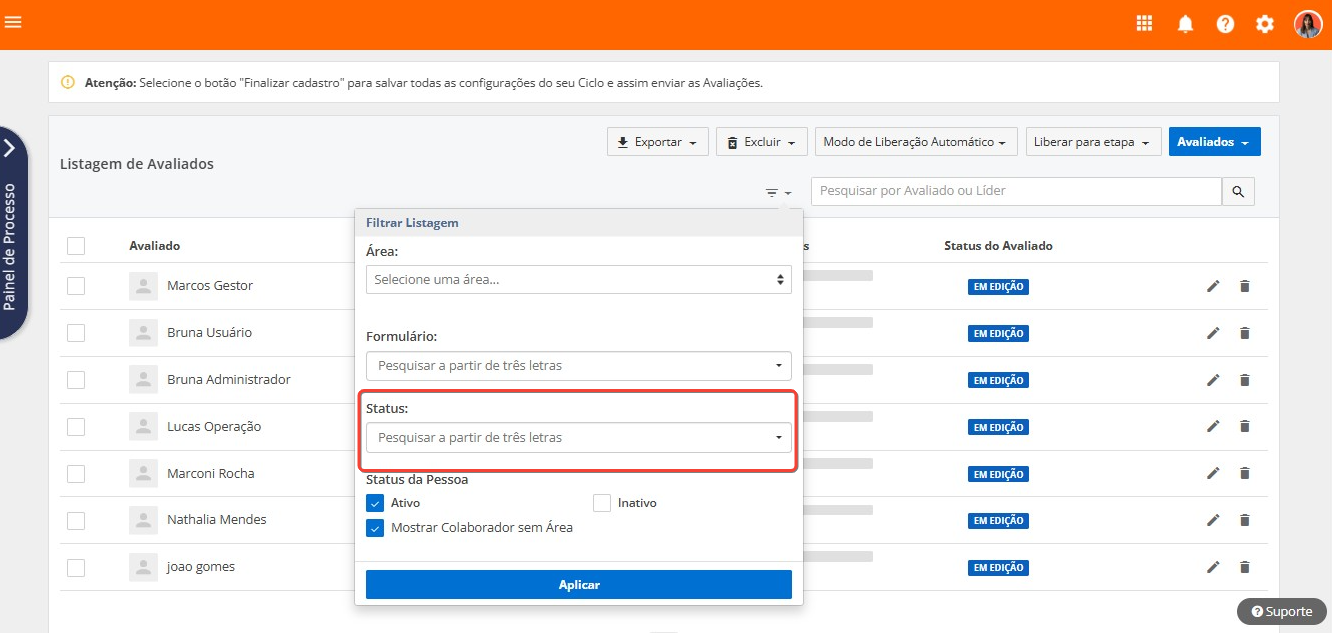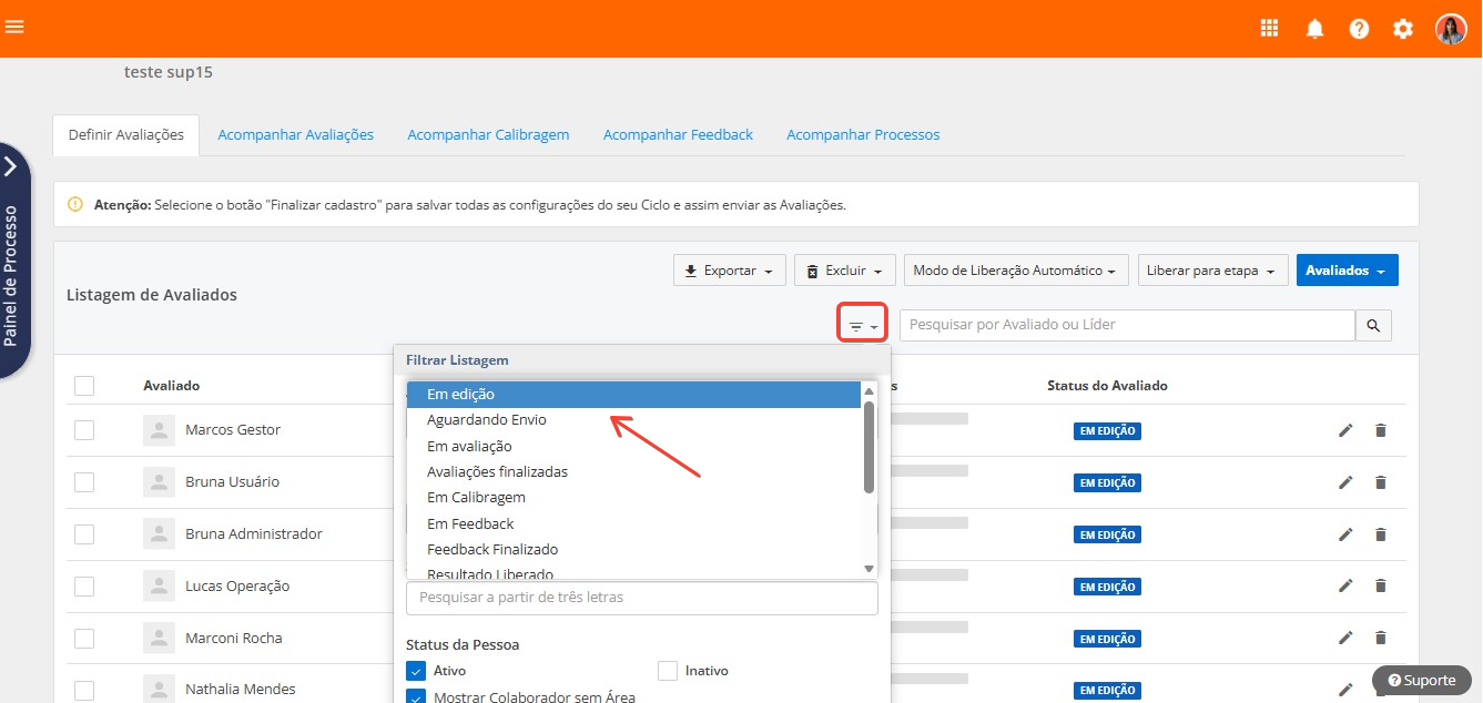 Atenção! Podem haver colaboradores com status em edição para os quais também se deve enviar as avaliações. Isso ocorre nos casos em que a flag Liberar o Avaliado para a etapa Avaliações não foi selecionada no momento de adicionar o colaborador ao ciclo: