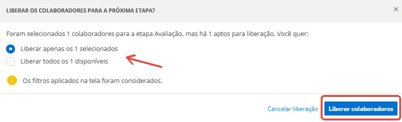 Em seguida, defina se vai liberar para a etapa de avaliação todos os colaboradores listados ou apenas o(s) selecionado(s), e clique em :
