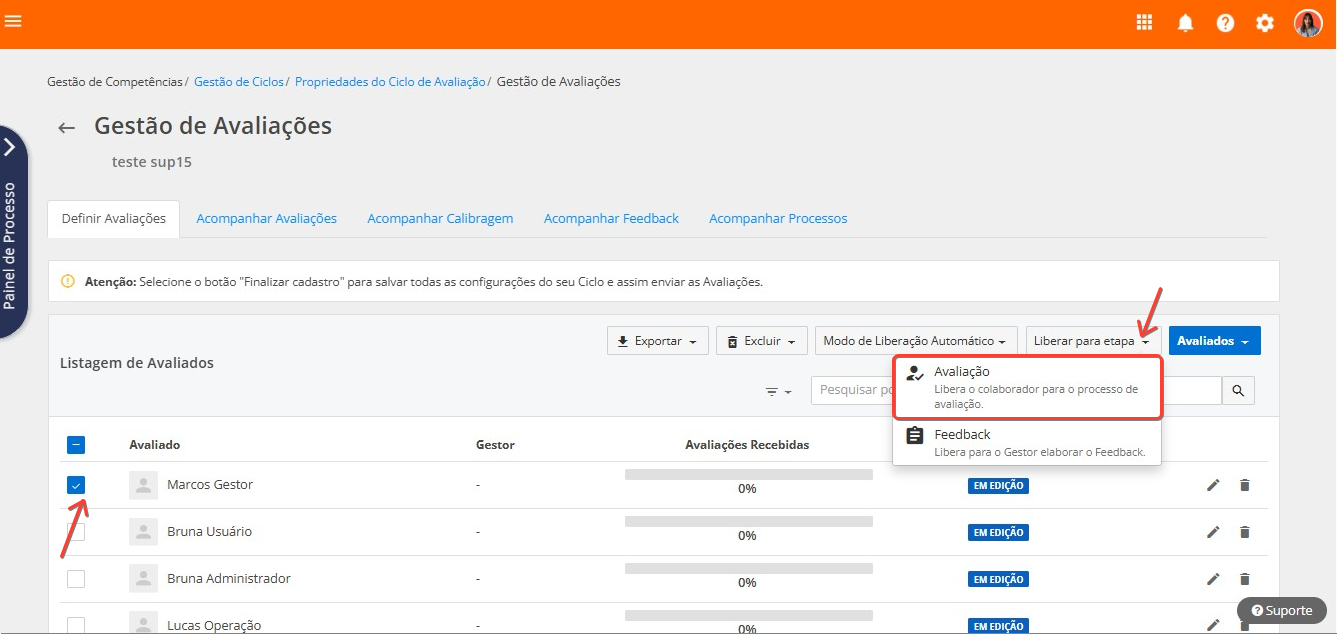 Para liberar para a etapa de avaliações os colaboradores com status em edição, selecione um ou mais de um avaliado e clique em e em Avaliações: