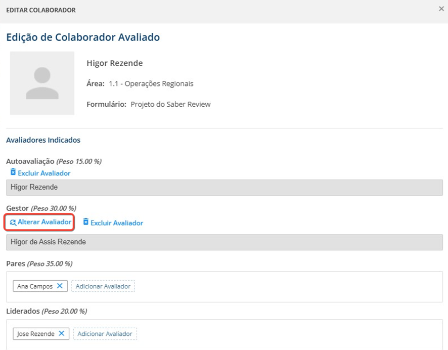 Na tela Editar Colaborador Avaliado, clique em Alterar Avaliador: