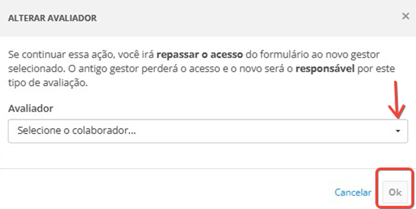 Observação: Ao realizar a alteração, você irá repassar o acesso do formulário ao novo avaliador e o antigo perderá o acesso ao mesmo. O novo avaliador será o responsável por esse tipo de avaliação.