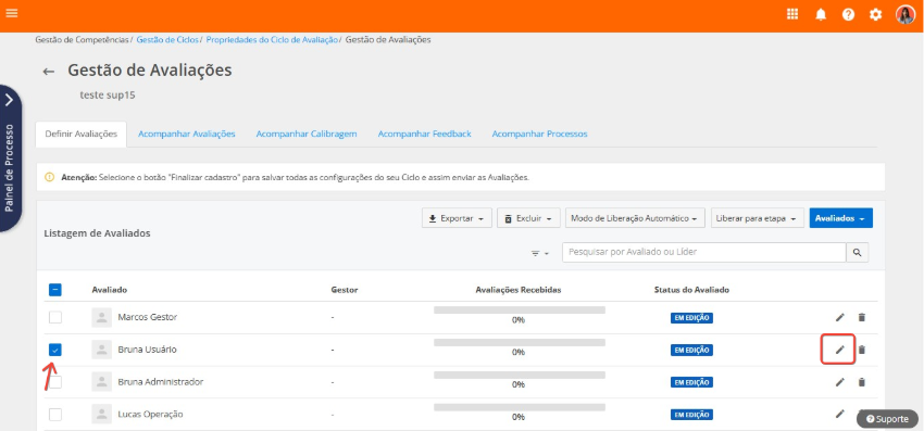 Para editar os avaliadores de um colaborador com status em edição, selecione esse colaborador e clique no ícone do lápis: