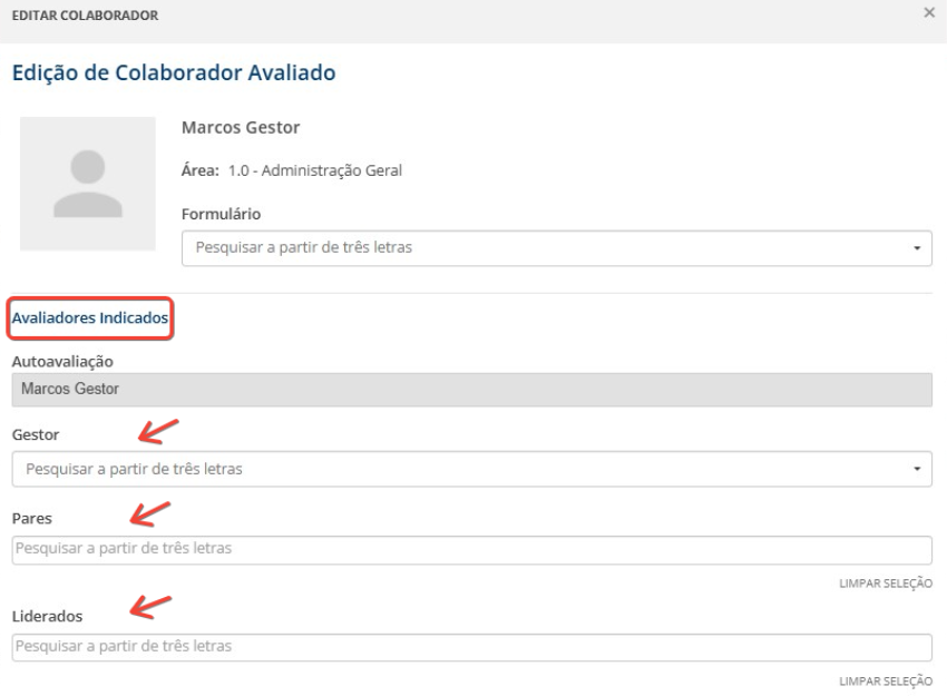 Na tela Edição de Colaborador Avaliado, na seção Avaliadores indicados, faça a inclusão dos avaliadores pesquisando pelo nome deles na barra de pesquisa: