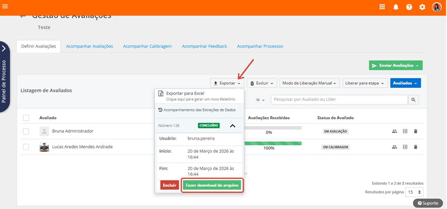 Para realizar a exportação desse arquivo, clique em Exportar e, na sequência, em Fazer download do arquivo: