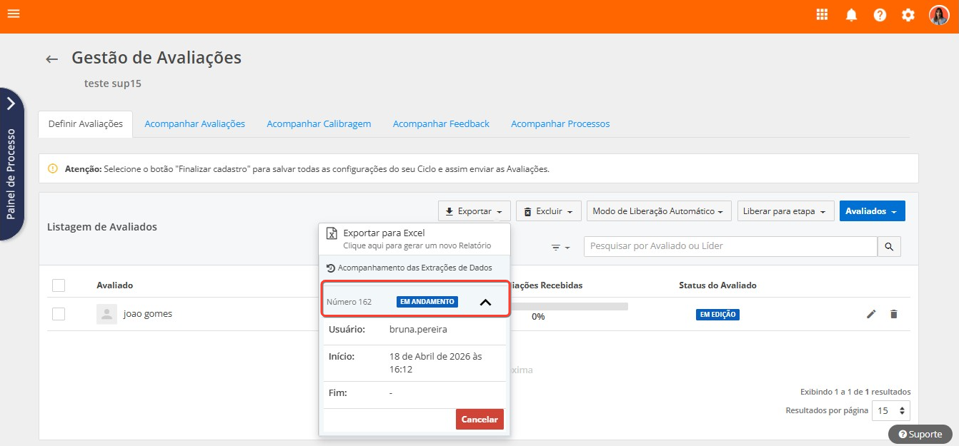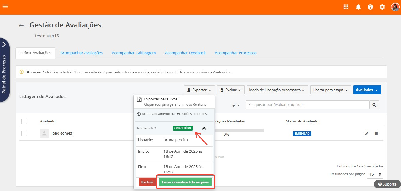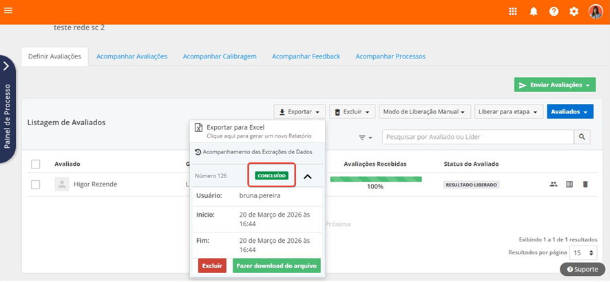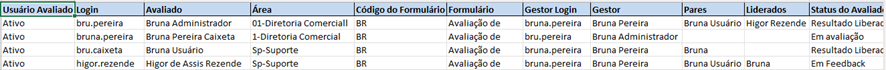 Para auxiliar na gestão dos avaliados do ciclo, pela tela Definir Avaliações, é possível exportar o arquivo .xls Detalhes do Avaliado, com as seguintes informações: