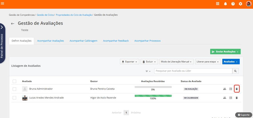 Para excluir um avaliado individual e manualmente do ciclo de avaliações, na tela Definir Avaliações, clique no ícone da lixeira presente no nome do avaliado:
