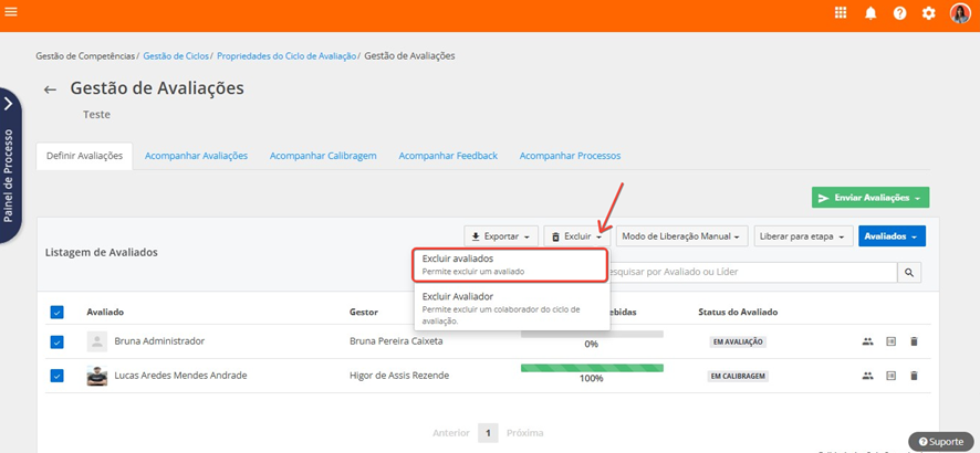 Para excluir muitos avaliados de uma só vez, selecione todos os colaboradores que deseja remover, clique em Excluir e, na sequência, em Excluir avaliados:
