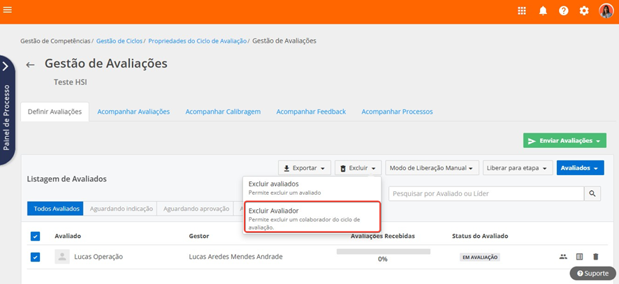 Nos casos em que seja necessário excluir de uma única vez um avaliador presente em várias avaliações, esta opção é a mais indicada.