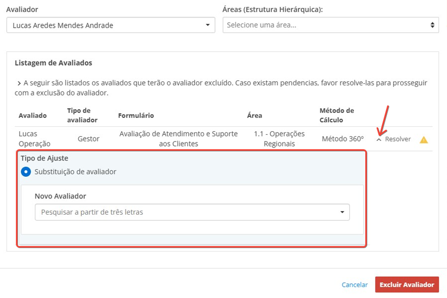 Havendo a necessidade de escolher um novo avaliador para o avaliado, tendo em vista o método de cálculo cadastrado, o sistema indicará com Resolver: