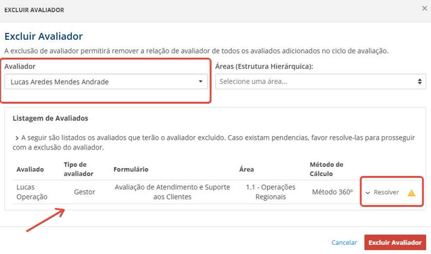 Na janela Excluir Avaliador, selecione o avaliador a ser removido na barra Avaliador. Para buscá-lo pela área de pertencimento, basta expandir a barra de pesquisa Áreas: